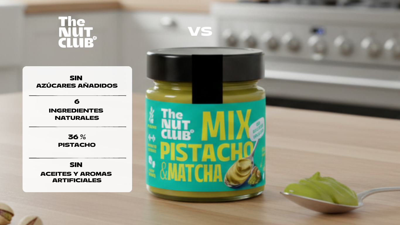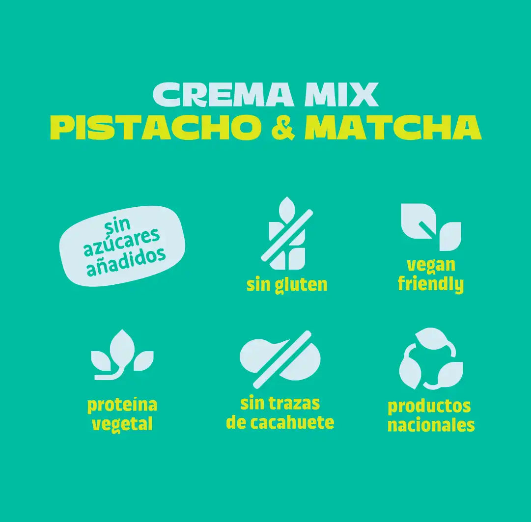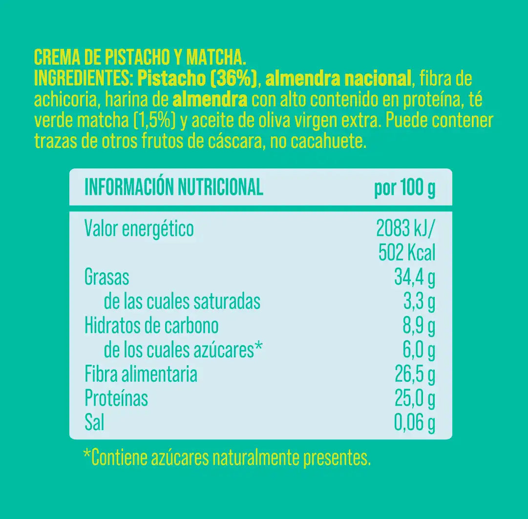 | CREMA DE PISTACHO Y MATCHA. INGREDIENTES: Pistacho (36%), almendra (Origen: España) fibra de achicoria, harina de almendra desgrasada, té verde matcha (1,5%) y aceite de oliva virgen extra. Puede contener trazas de otros frutos de cáscara, no cacahuete. | |